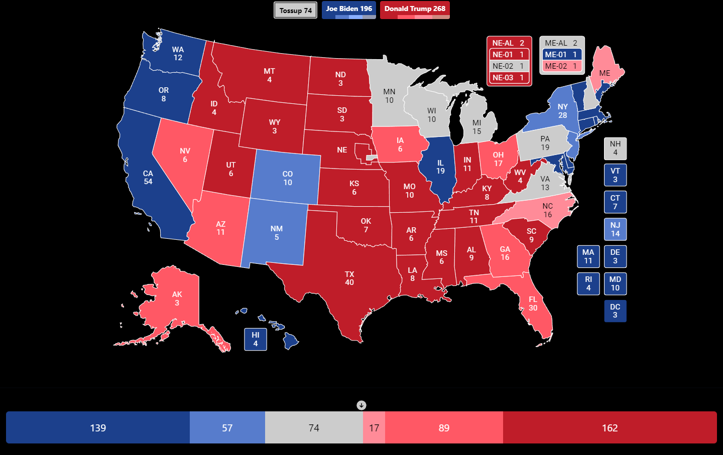 It will certainly come down to Pennsylvania; expect this to be among this cycle's narrowest, hardest-fought, and most consequential states. Not to mention that Pennsylvania prefers to vote in step with its other Rust Belt compatriots, Wisconsin and Michigan (all three combined boast 44 electoral votes). I am omitting an analysis of Michigan, another state in which Mr. Biden and Mr. Trump are locked in a dead heat because the states are so similar in their voting habits and demographics. I can confidently predict that if Pennsylvania goes red, so goes Michigan.